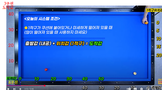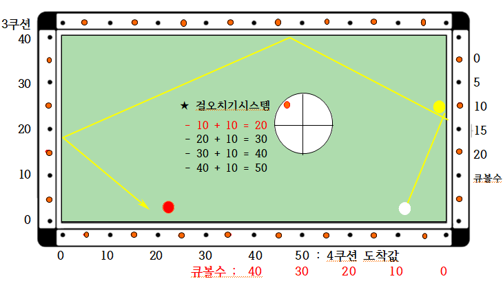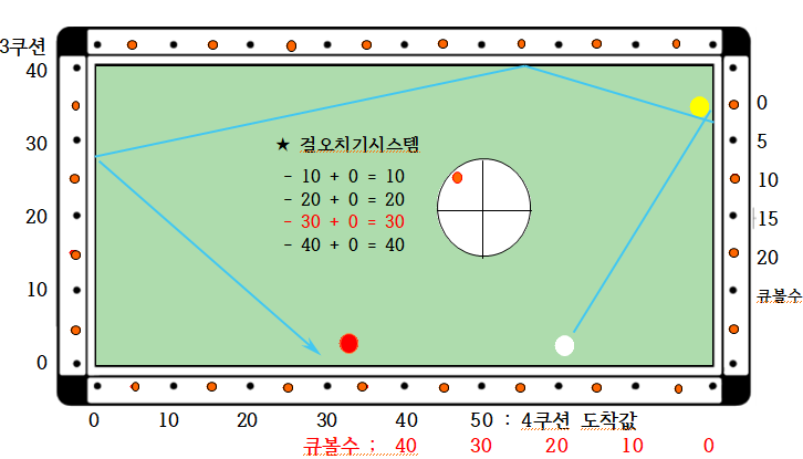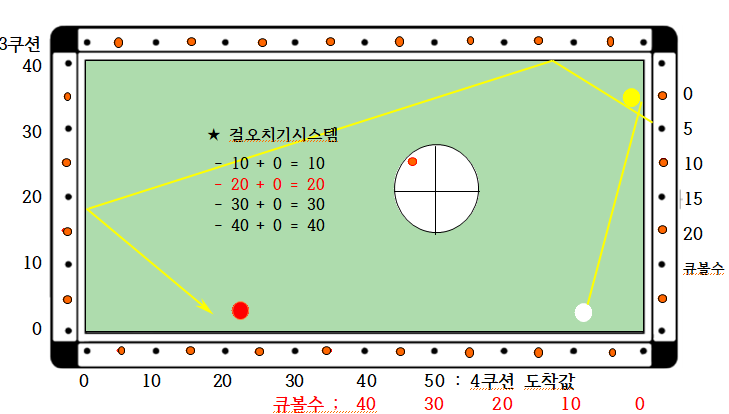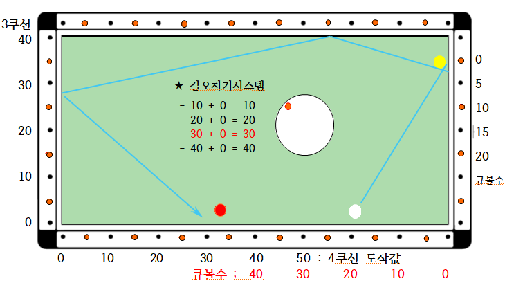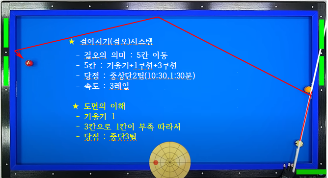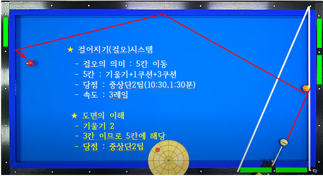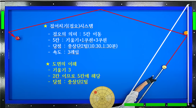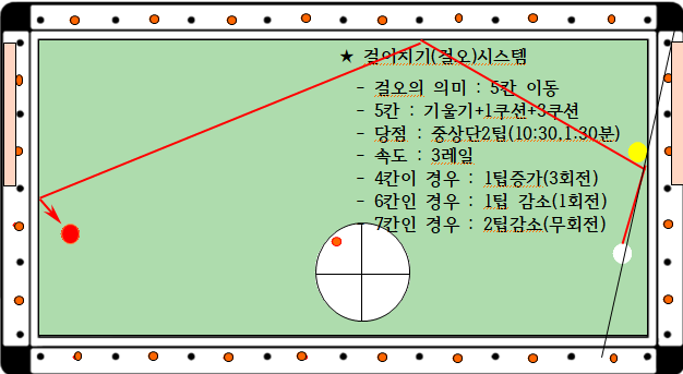 - 걸오의 의미 : 기울기 포함 큐볼이 5칸을 이동하여 3쿠션으로 득점할 수 있니다,