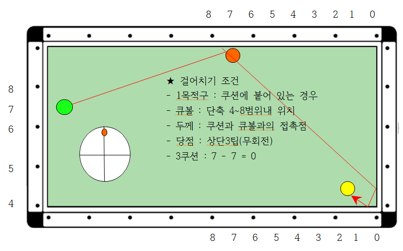 계산값이 0(7-7-0)이므로 무회전(상단3팁) 큐볼수 7에서 부드럽게 1목적구수 7로 보내면 3쿠션은 0지점을 거쳐 2목적구를 맞추게 된다. 특히 계산값이 0인경우 한계값이므로 잘 기억하였다가 이용하여야 합니다.