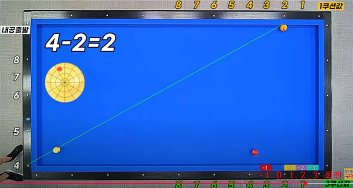 나. 4 - 2 = 2 인데 1목적구가 -1팁 구간에 위치하고 있어 "역중상단1팁"으로 큐볼을 보낼수 있으면 득점이 가능합니다.