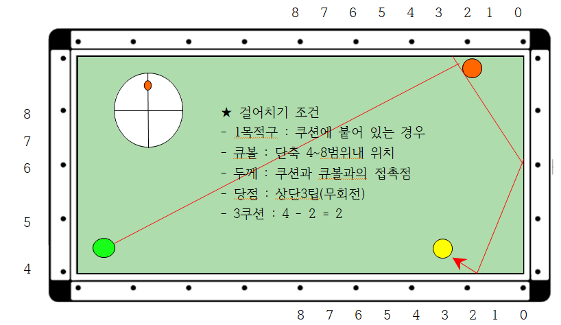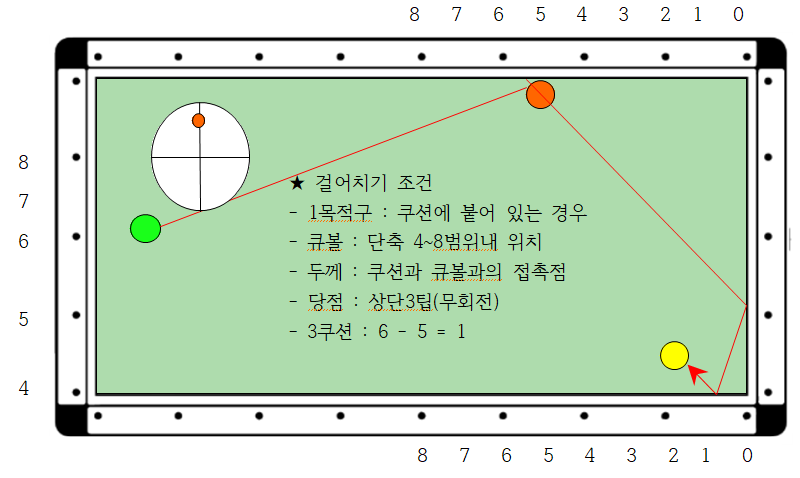 라. 1목적구와 장쿠션이 맞닿는 지점을 향하여 큐볼을 보내면 큐볼이 장쿠션에 먼저 닿아 걸어치기가 된다.