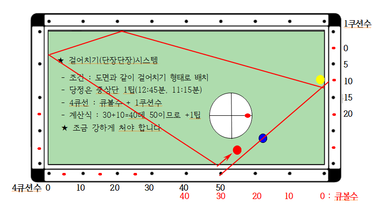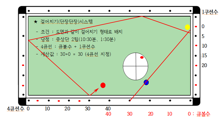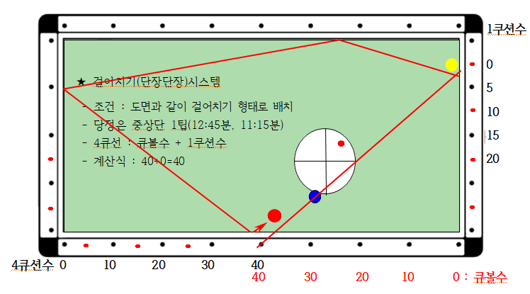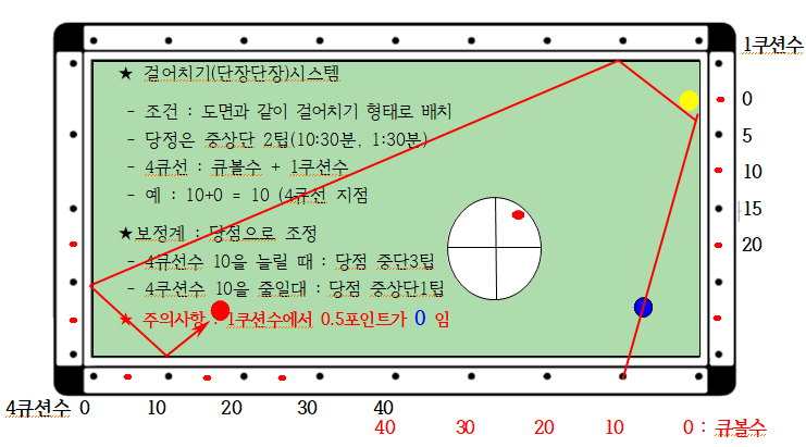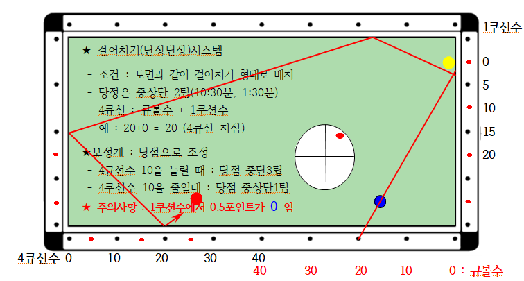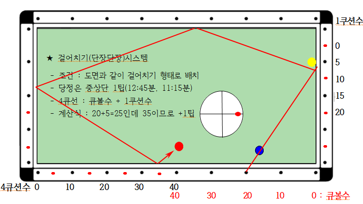 3) 4큐선 : 큐볼수 + 1쿠션수 ( 예 : 10+0 = 10, 4큐선 지점)