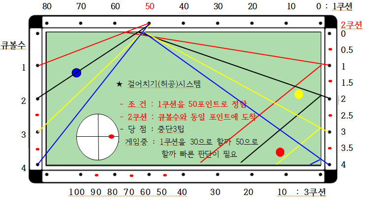 4) 게임중 : 1쿠션을 50으로 하여 1:1 보정을 하면 됨.