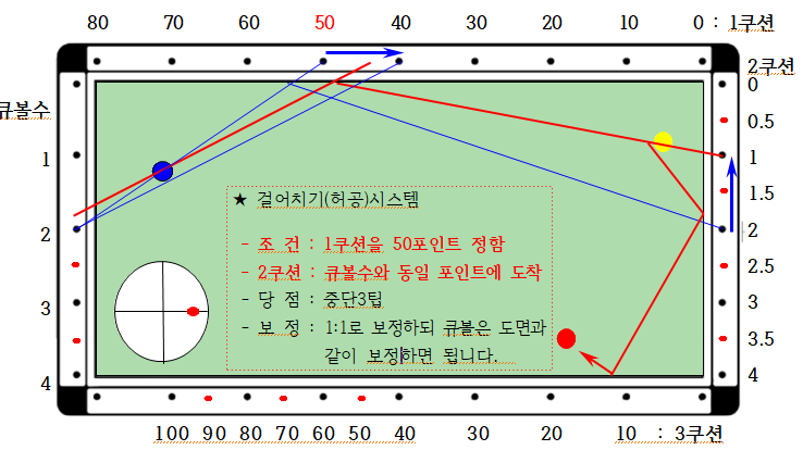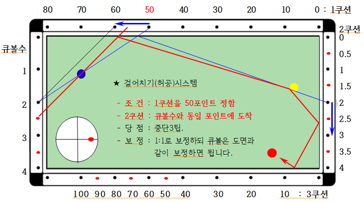4) 보 정 : 1:1로 보정하되 큐볼은 도면과 같이 보정하면 됩니다.