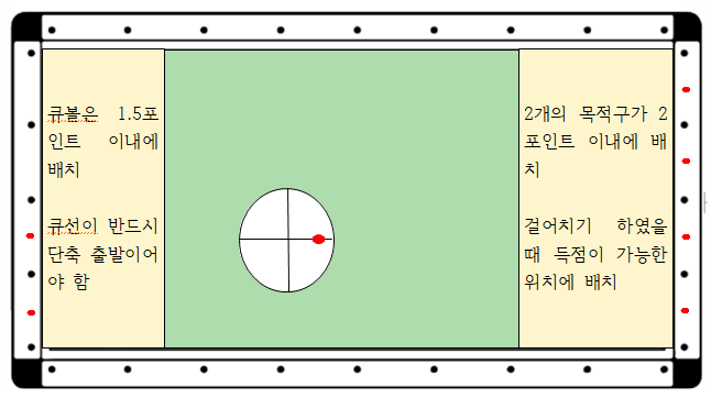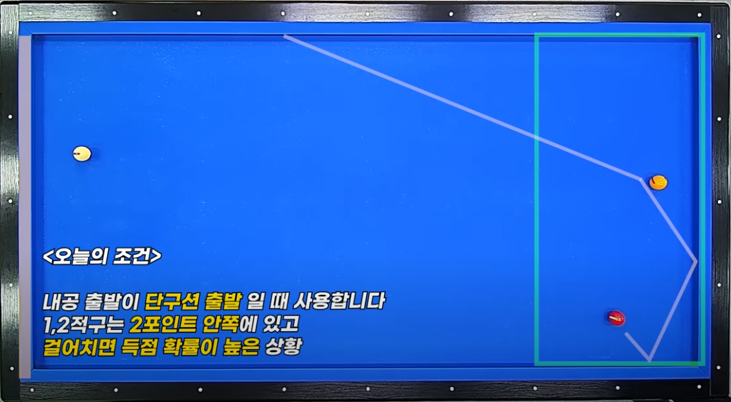 1) 큐볼은 단쿠션 1.5포인트 이내에 배치, 큐선이 반드시 단축 출발이어야 함.