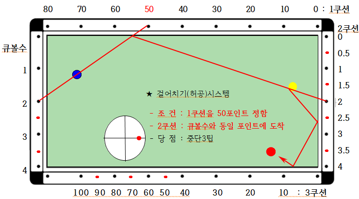 2) 2쿠션 : 큐볼수와 동일 포인트에 도착