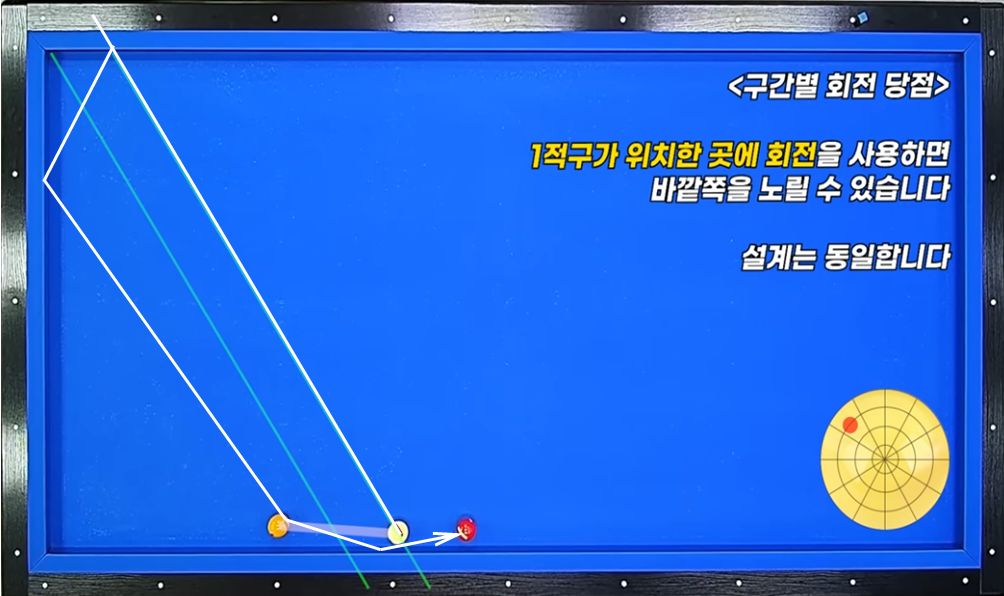 5. 무회전으로 큐볼을 보내면 1목적구 넣어치기가 되고