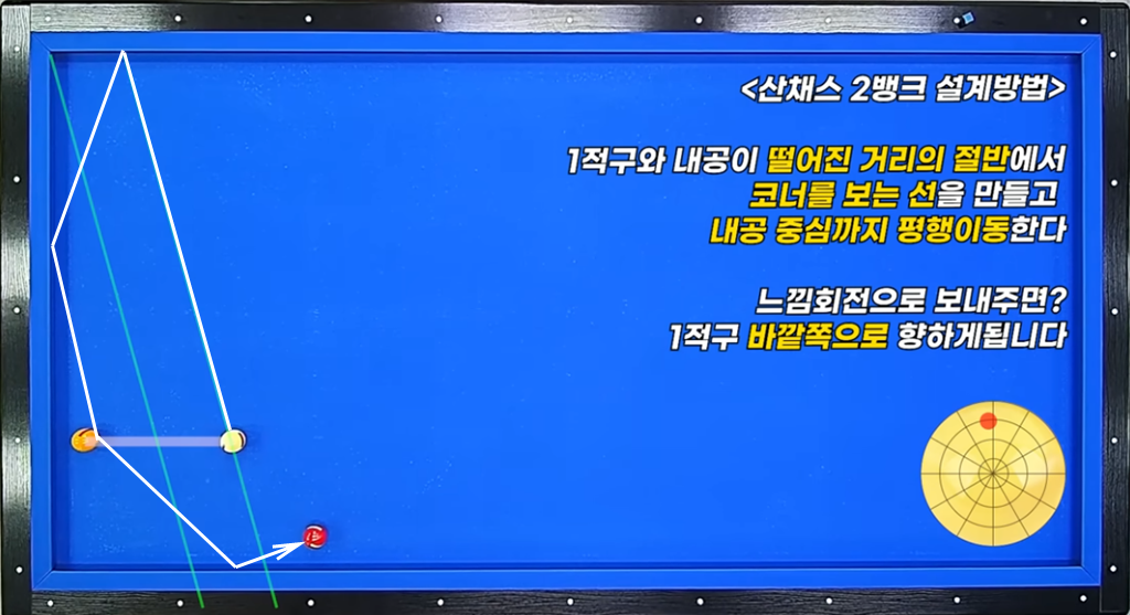 1. 1목적구와 큐볼(내공)의 중심점으로 연결하고 이등분 지점을 표기하고