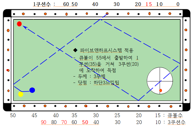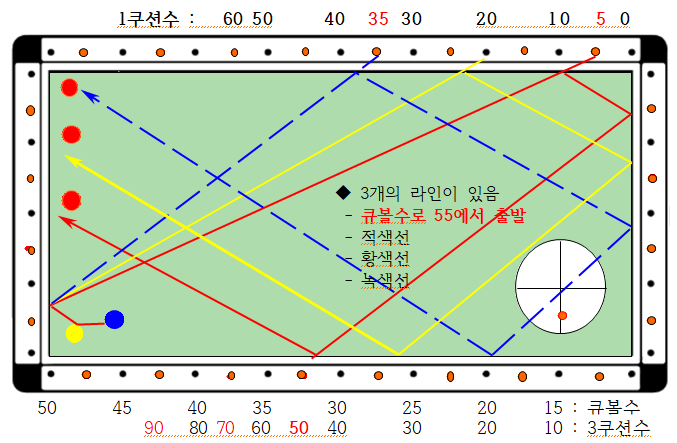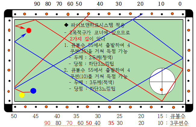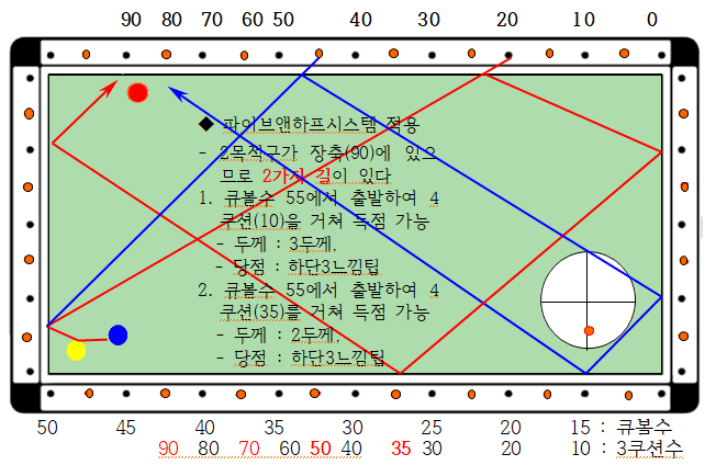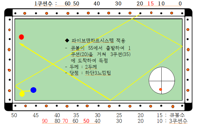 - 황색선 : 2두께 및 하단3느낌팁으로 큐볼을 큐볼수(55, 1쿠션)에서 2쿠션수(20)로 보내면 4쿠션(35)을 거쳐 득점하게 됩니다.