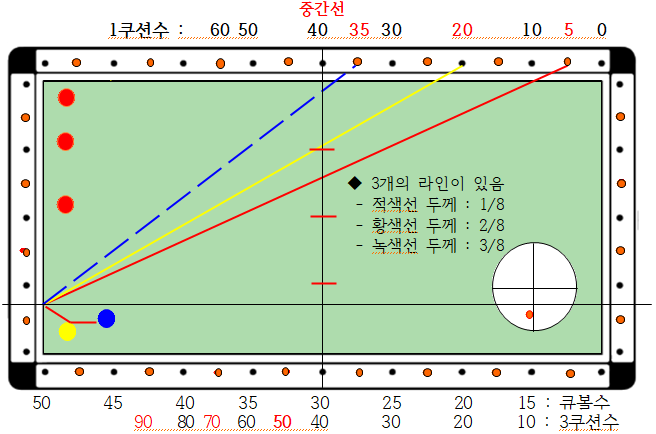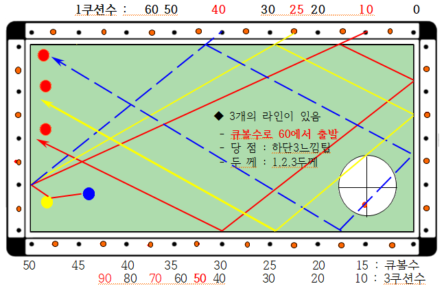 - 황색선 : 2두께 및 하단3느낌팁으로 큐볼을 큐볼수(60)에서 2쿠션수(25)로 보내면 4쿠션(35)을 거쳐 득점하게 됩니다.