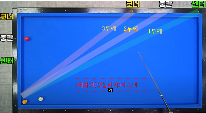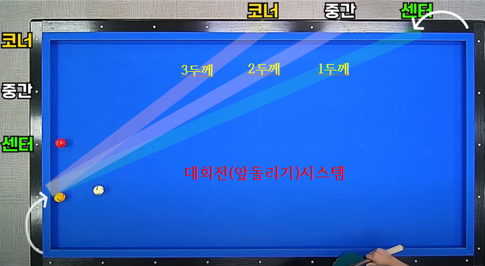 "대회전(앞돌리기)시스템"는 앞돌리기 형식으로 큐볼을 보내는 대회전으로 '파이브앤하프시스템'을 이용하는 것인데 가장 어려운 것이 두께를 정확하게 치는 것입니다.