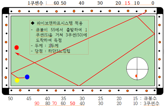 - 적색선 : 1두께 및 하단3느낌팁으로 큐볼을 큐볼수(55, 1쿠션)에서 2쿠션수(5)로 보내면 4쿠션(50)을 거쳐 득점하게 됩니다.