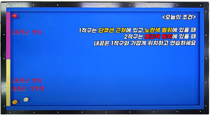 2) 큐볼은 1목적구 근방에 위치한 것이 좋습니다. 이유인즉 1목적구 두께를 정확하게 치기 위한 것인데 두께에 자신이 있다면 조금 더 떨어져 있어도 문제 없습니다.