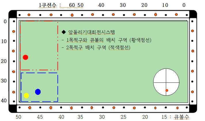 1) 큐볼, 1목적구 및 2목적구는 도면과 같이 점선 범위에 있을 때 효과가 좋습니다.