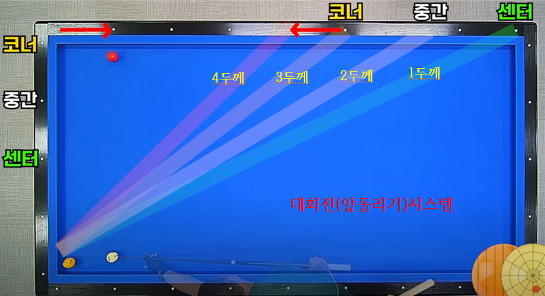 - 청색선 : 3두께 및 하단3느낌팁으로 큐볼을 큐볼수(60)에서 2쿠션수(40)로 보내면 4쿠션(20)을 거쳐 득점하게 됩니다.