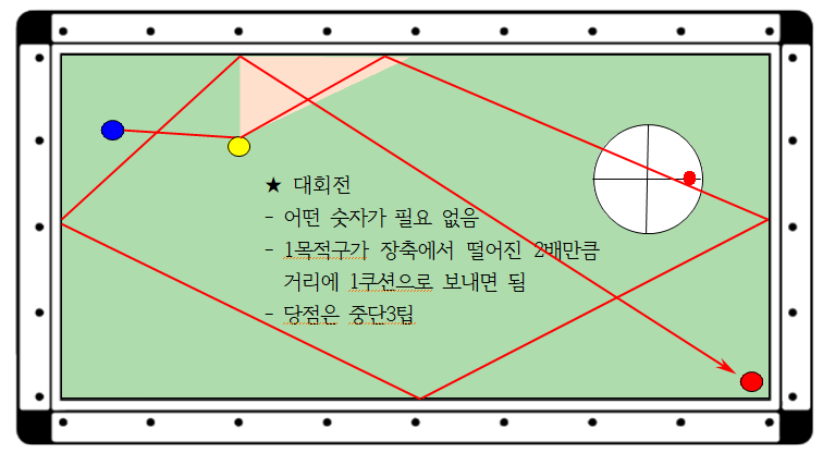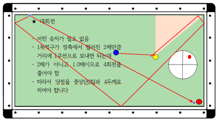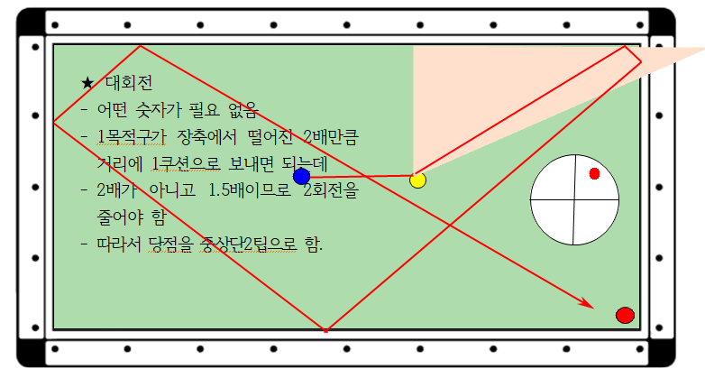 대회전시스템(삼각형법)의 특징은 반드시 1목적구를 지나서 뒤돌려치기를 하는 경우에 적용됩니다