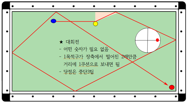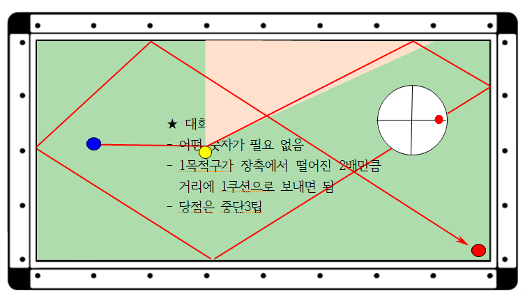 도면과 같이 1목적구가 장축에서 떨어진 거리의 2배만큼의 거리에 1쿠션으로 역중단3팀, 속도는 가장 빠른 속도인 4레일 이상으로 부드럽고 강하게 돌려야 하고 큐대는 롱팔로우로 큐볼을 보내야 합니다.