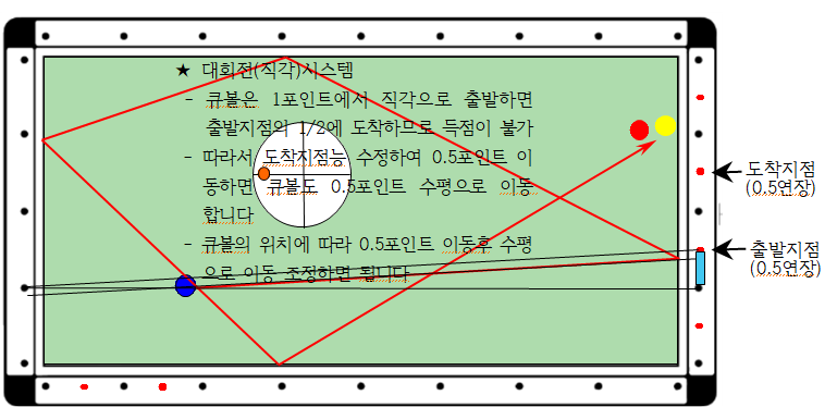 - 큐볼은 장축 1포인트에서 직각으로 출발하면 출발지점의 1/2에 도착(1.5포인트)하므로 득점이 불가