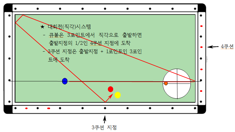 - 4쿠션 지점 : 큐볼 출발 지점(2포인트)의 +1 포인트 = 3포인트