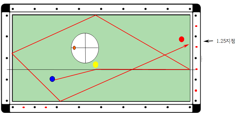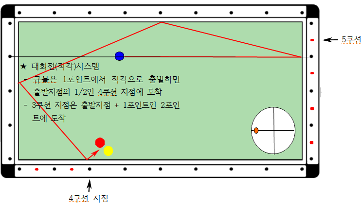 - 5쿠션 지점 : 큐볼 출발 지점( 2포인트)의 1/2 지점 = 단축 1쿠션 지점