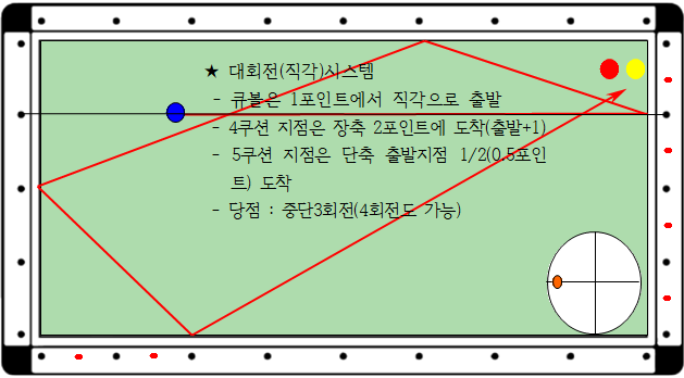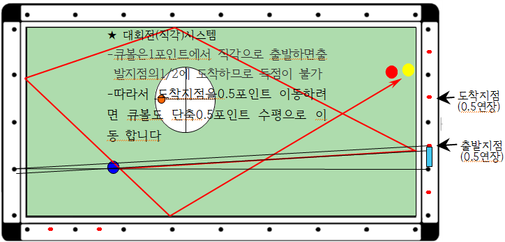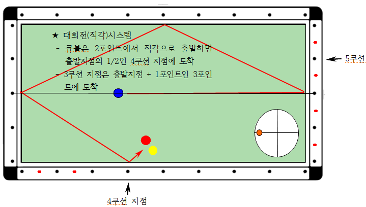 - 큐볼은 3포인트에서 직각으로 출발하면 출발지점의 1/2에 도착하므로 득점이 불가