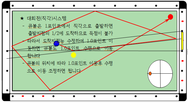 - 큐볼은 1포인트에서 직각으로 출발하면 4쿠션으로 1쿠션+1포인트 지점에 도착