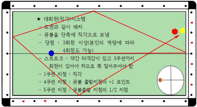 - 큐볼을 1포인트에 중단3팁으로 타격감 있게 밀어주면 5쿠션으로 코너에 도착하여 득점이 가능