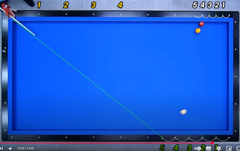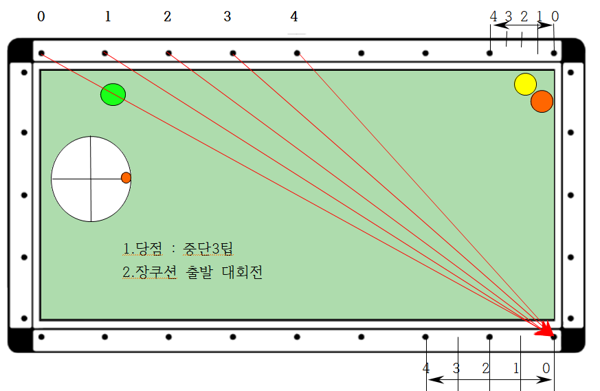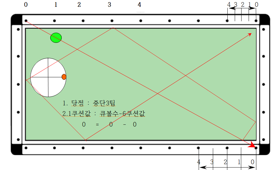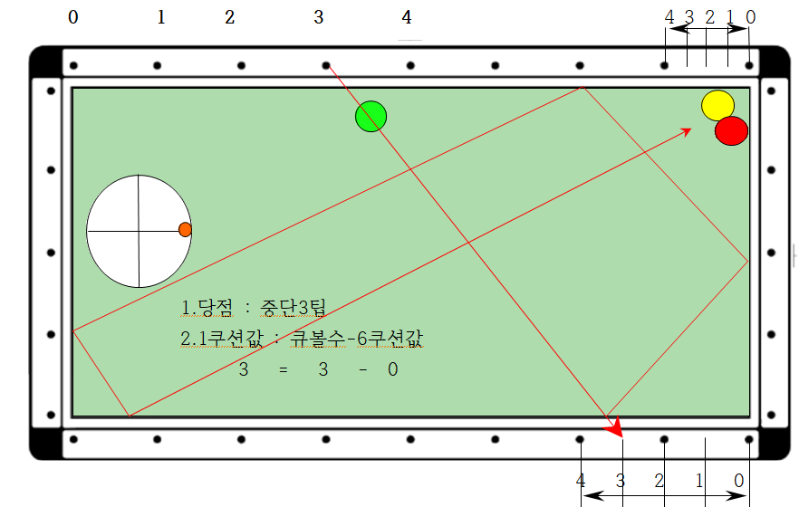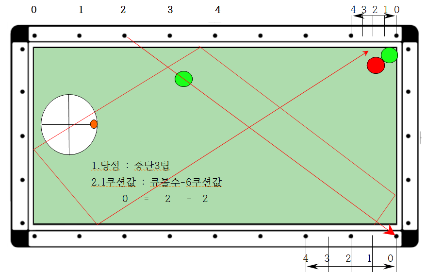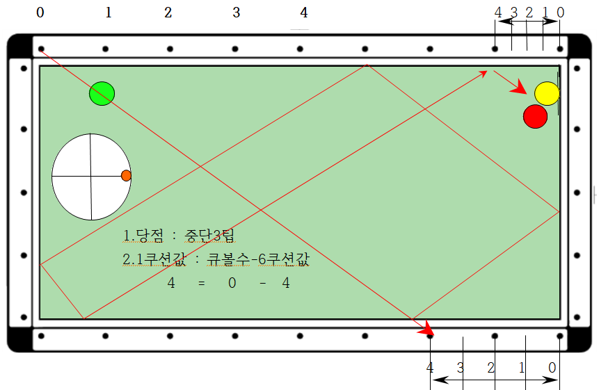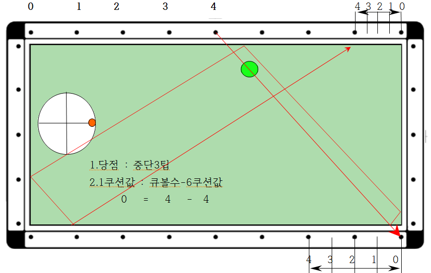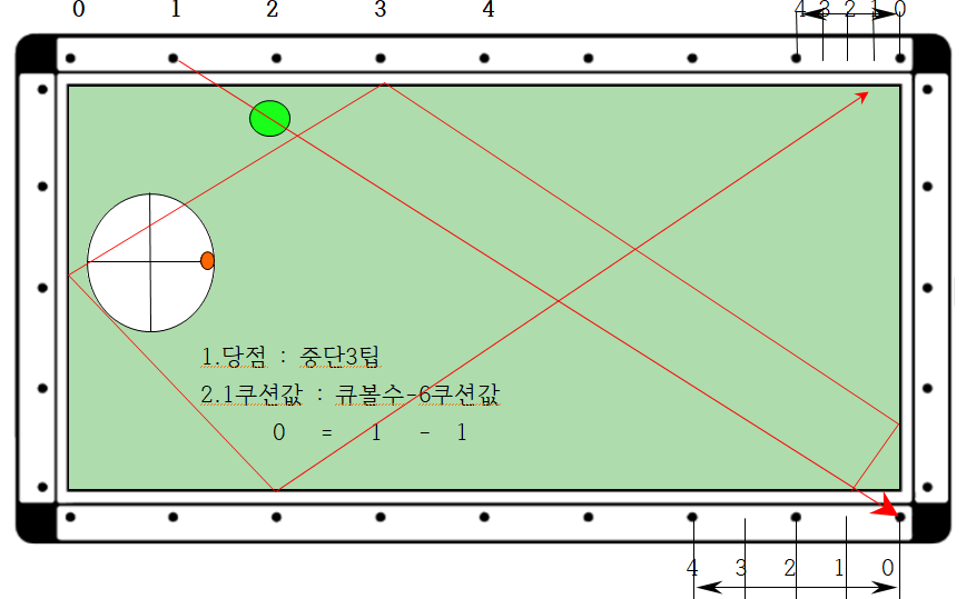 2. 따라서 큐볼을 중단3팁으로 장쿠션 0포인트에서 1쿠션 4지점(2포인트)으로 보낼 경우 6쿠션으로 4지점에 도착하므로 득점할 수 있다는 논리입니다