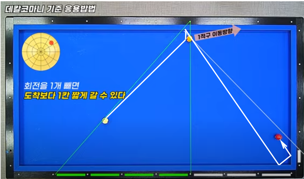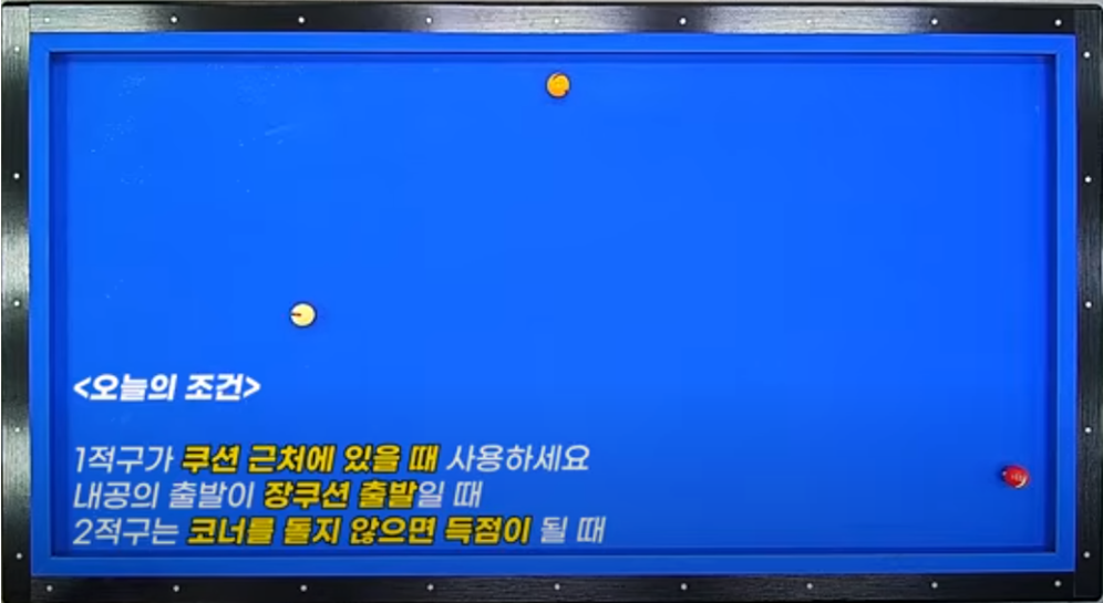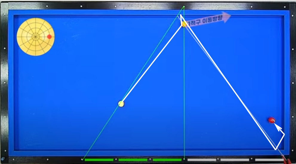 더블쿠션을 치기위한 조건인데 출발지점이 반드시 장쿠션으로 장쿠션에서 출발시 기울기만큼 내려가서 2쿠션지점이 도힌다는 논리입니다