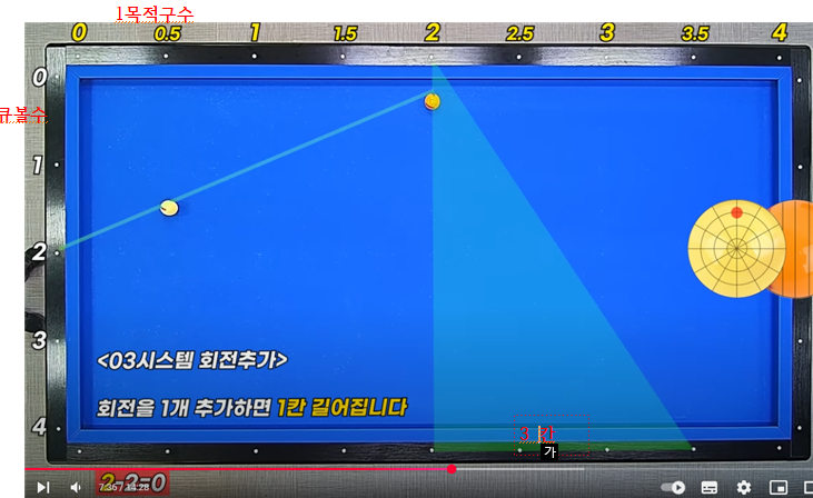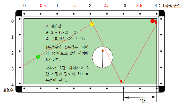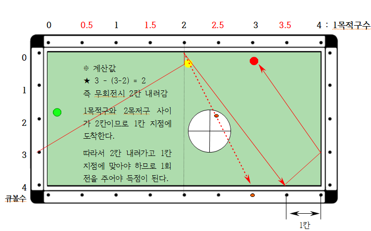 - 그런데 큐볼이 내려가는 지점(2칸)과 목적구 사이의 간격 숫자(1칸)가 일치 하지 않으므로 1회전을 추가하여 ""1회전 3두께 2.5레일"" 속도로 보내면 득점확률이 좋습니다.