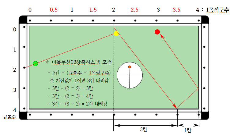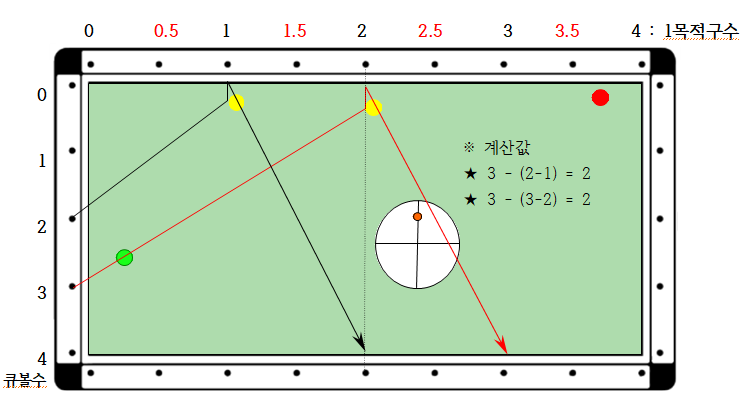 ※ 참고로 계산값이 안 나올 경우 { 3- ( 4 - 1) = 0} 에는 더블쿠션으로 사실상 어려우므로 다른 방법을 검토하시기 바랍니다.