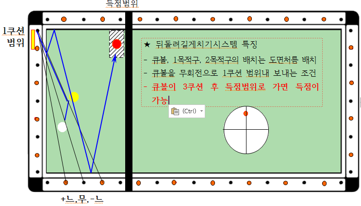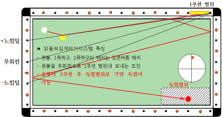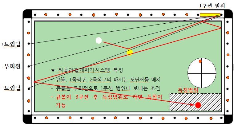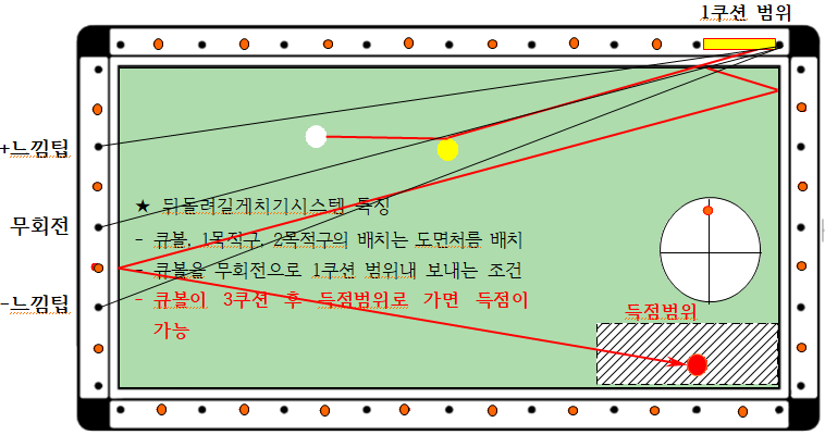 ◆ 대회전(무회전)을 치는 조건과 동일하나 1쿠션 지점이 다른 점이 약간의 차이가 있습니다 즉 대회전은 1~3포인트 사이 이나, 여기 뒤돌려길게치기시스템은 반드시 1포인트 이내에 1쿠션이 되어야 하는 점이 다릅니다