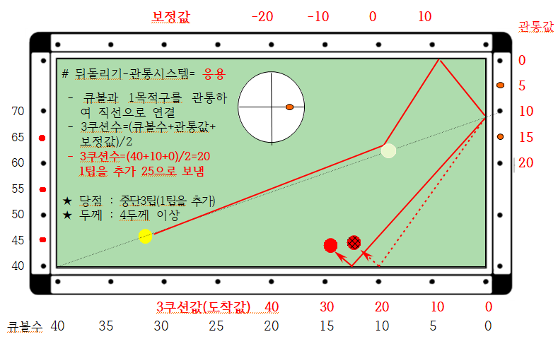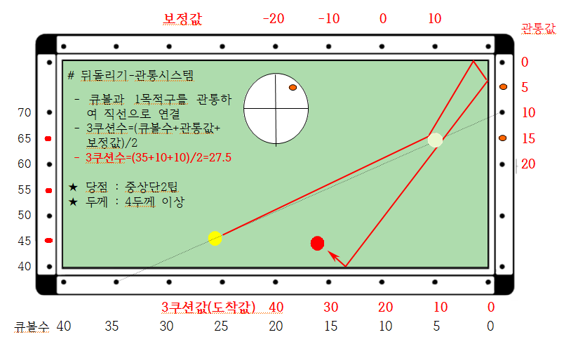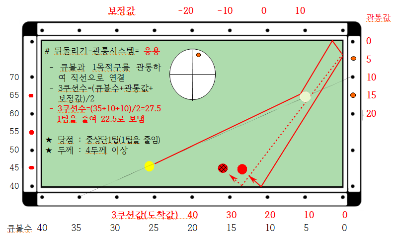 ※ 뒤돌려치기인데 3쿠션 지점 계산갑을 구하기 위하여 큐볼과 1목적구 중앙을 관통하여 값을 구한다는 의미로 관통시스템이라 명명하였습니다