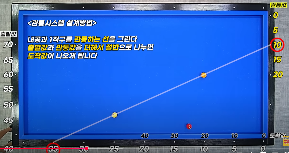 4) 관통이란 의미는 아래 도면과 같이 큐볼과 1목적구를 관통하여 값을 정한다는 의미입니다. 즉 큐볼수 35, 1목적구수 10를 합히여(35+10=45) 이것을 2로 나누면(45/2=22.5) 이 값이(22.25) 도착값입니다