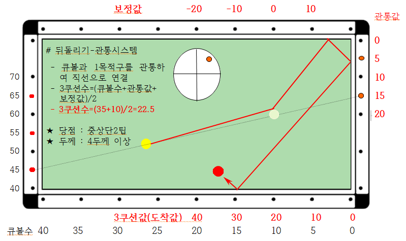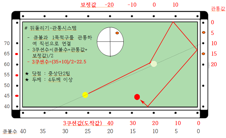 5) 3쿠션값 = ( 큐볼수 35 + 관통값 10 + 보정값 0 ) / 2 = 22.5