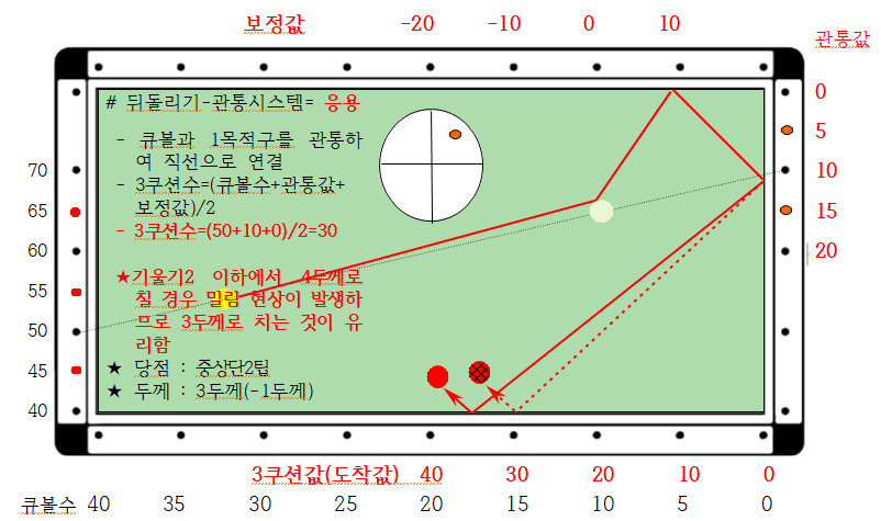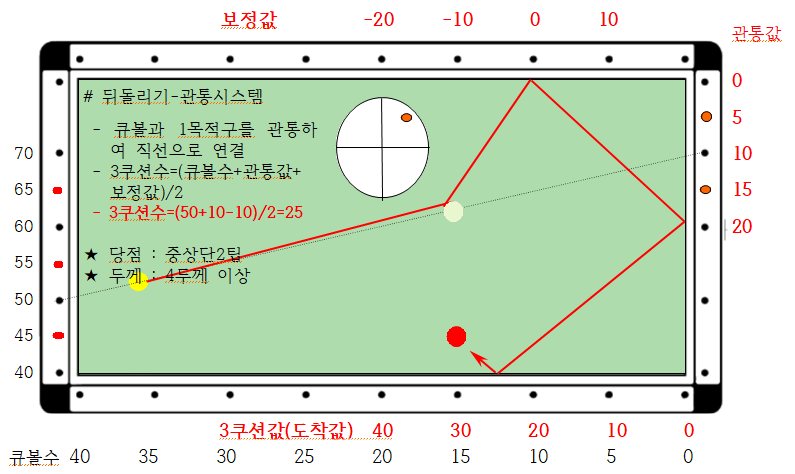 1) 3쿠션값 = ( 큐볼수 50 + 관통값 10 + 보정값 -10 ) / 2 = 25
