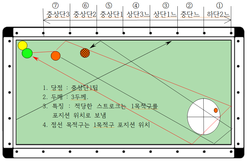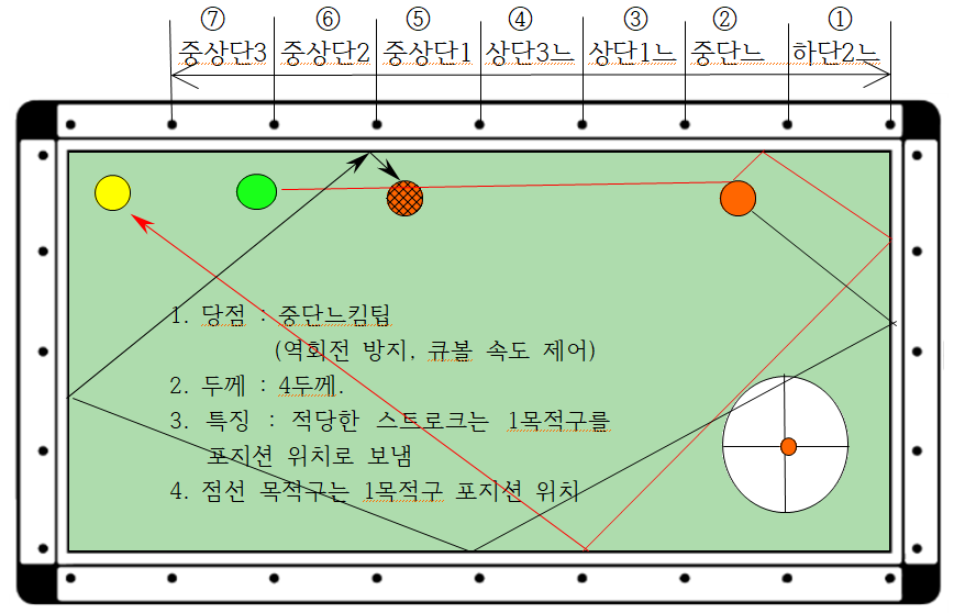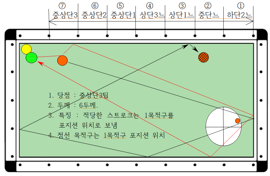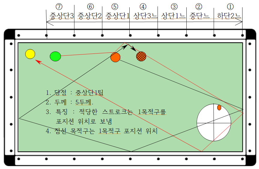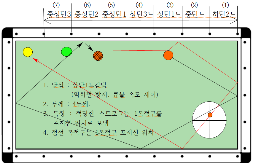 3) 특히 ⑦번은 6두께와 3두께 2가지가 있는데, 이 경우에는 키스도 피하고 1목적구가 장쿠션 인접 포지션에 배치되도록 적당한 스트로크로 보내는 것이 제일 중요합니다.