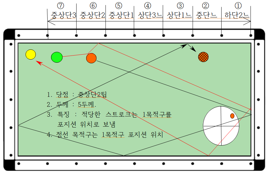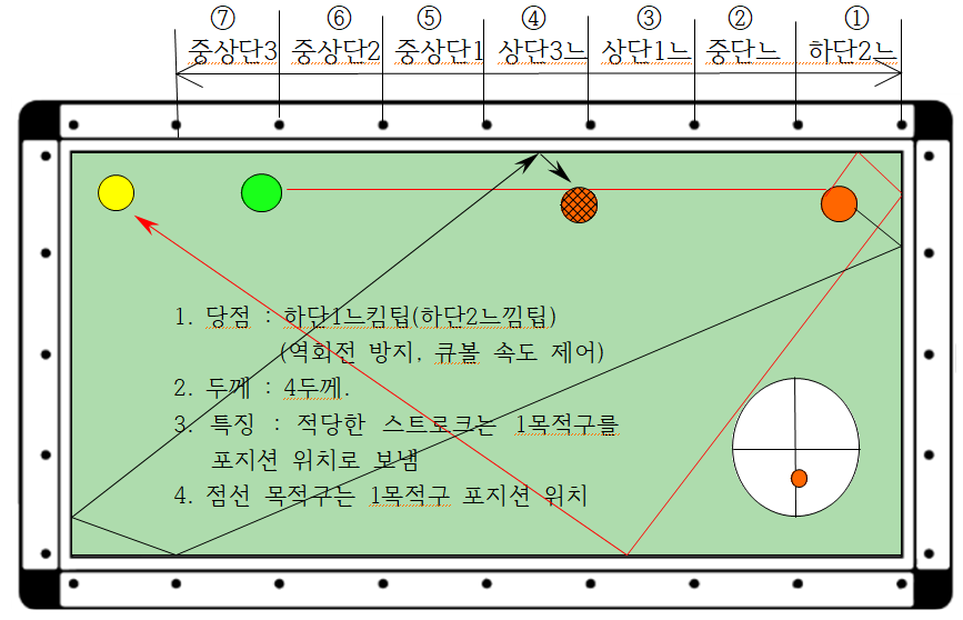 5. 스트로크는 1목적구가 포지션 위치에 가도록 적당한 힘을 사용하여야 함.