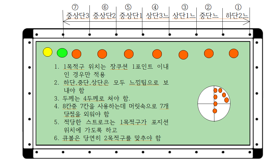 1) 배치 기준 : 1목적구가 장쿠션 1포인트 이내에 배치되어 있는 경우로 큐볼은 기울기1 이내에 배치되어 있고 당점만 7개의 위치마다 다르게 쳐야 합니다.