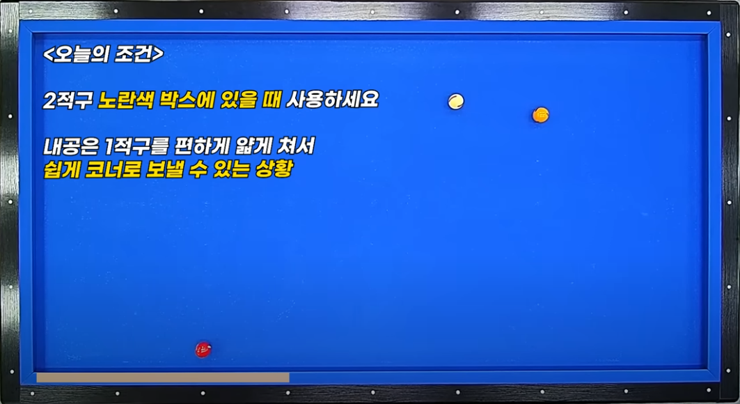 4. 당점은 무회진(상단3팁) 두께는 2두께 이하 스트로크는 미들팔로우 2레일 정도 속도로 부드럽게 보낸다.