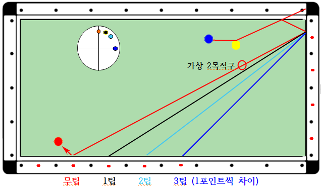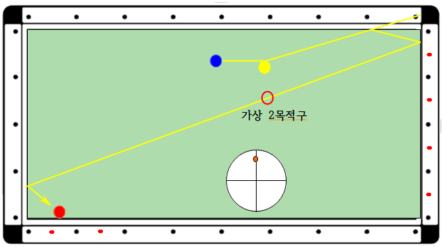 1. 아래 도면과 같이 큐볼을 2두께 이하 무회전으로 코너포인트로 보내면 가상2목적구 라인에 따라 3쿠션으로 득점이 가능합니다