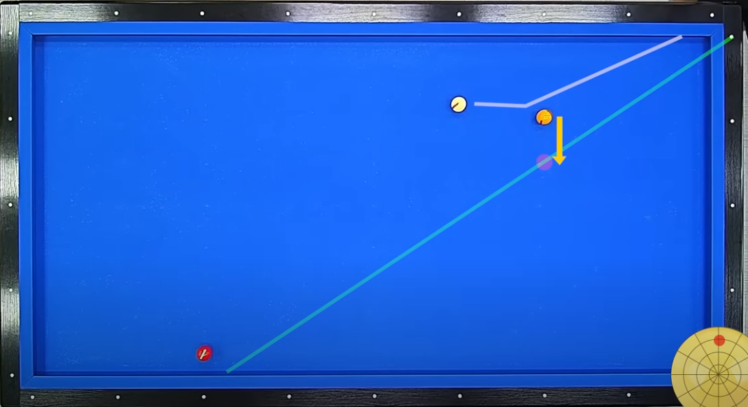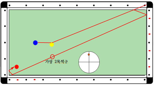 3. 큐볼을 무회전으로 1목적구에 뒤돌려치기로 코너포인트에 보내면 큐볼은 코너포인트를 거쳐 1목적구 수평거리 0.5포인트(가상2목적구) 위치를 거쳐 2목적구에 도착한다(즉 코너포인트에서 가상2목적구 직선위치)