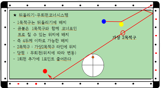 - 큐볼은 1목적구를 2두께 이하로 뒤돌려치기로 코너포인트에 칠 수 있는 경우