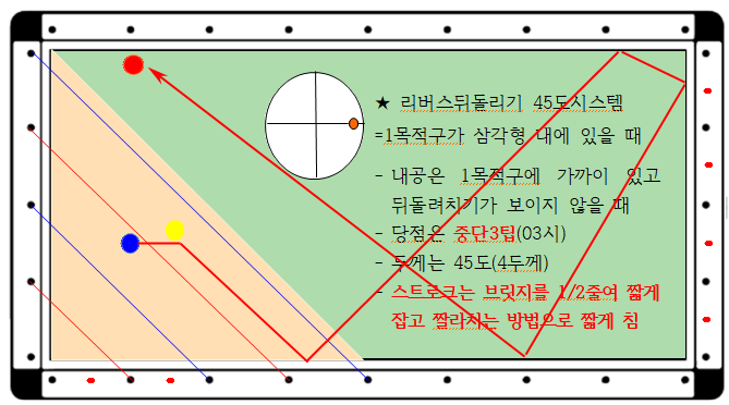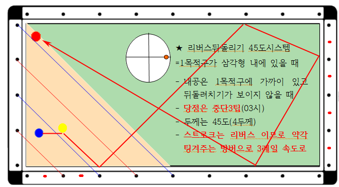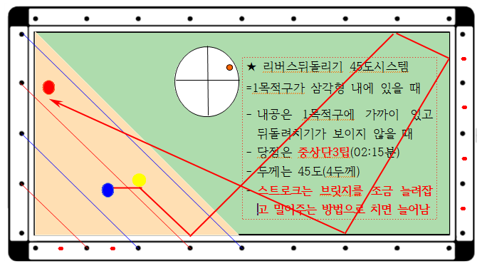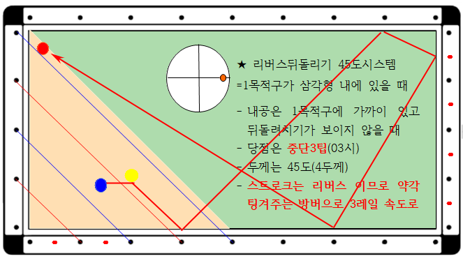일반적으로 뒤돌리기(리버스45)시스템이란 2 목적구가 코너에 근방에 있고 1 목적구는 도면 1과 같이 삼각형 안에 큐볼과 가까이 배치되어 있어 뒤돌려치기가 보이지 않을 때 이 시스템을 사용합니다