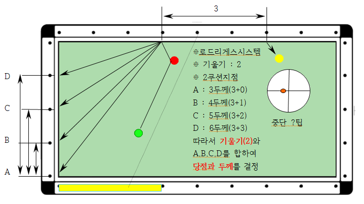 3. 1쿠션거리(노란색)와 2쿠션 지점(A,B,C,D)를 합하여 뚜께를 정한다
