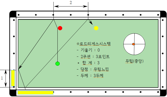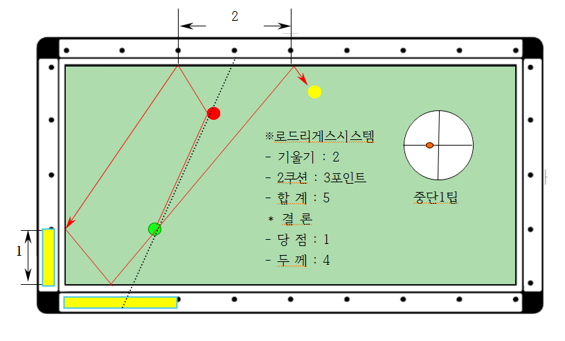 1. 큐볼로 1목적구를 4두께로 맞추었을 경우 맞는 지점을 1쿠션으로 하고, 4쿠션으로 맞는 지점을 파악하여 1쿠션과 4쿠션 거리를 측정한다. 여기서는 2포인트이다