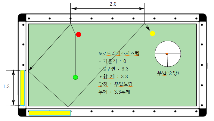 2. 제1항의 거리를 2로 나눈 수가 2쿠션 지점이 되고 여기서는 1.3포인트가 된다