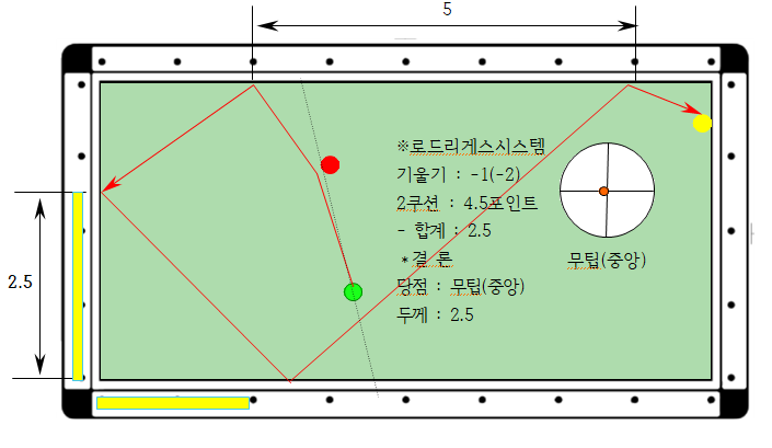 2. 제1항의 거리를 2로 나눈 수가 2쿠션지점이고 여기서는 2.5포인트가 됩니다)