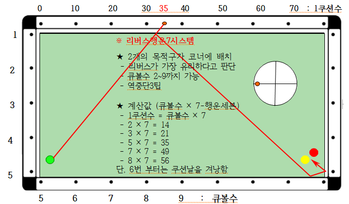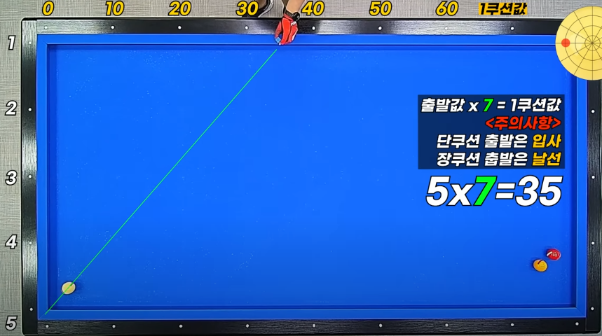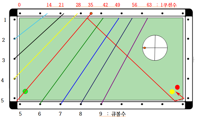 3) 큐볼수 5 × 7 = 35 즉 1쿠션으로 프레임포인트 35로 보내면 득점할 수 있습니다.