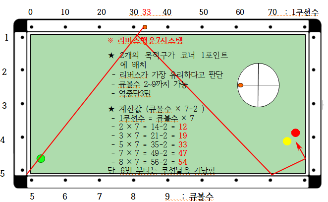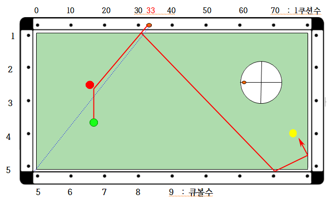 2) 1목적구는 큐볼수 5를 기준으로 계산하면 5 × 7 = 35-2 = 33