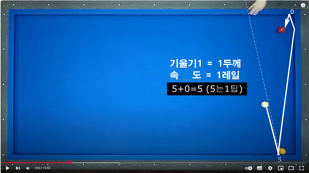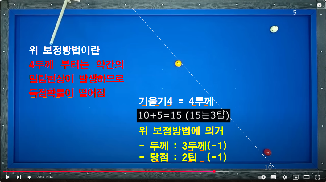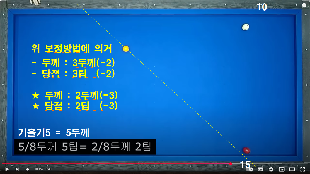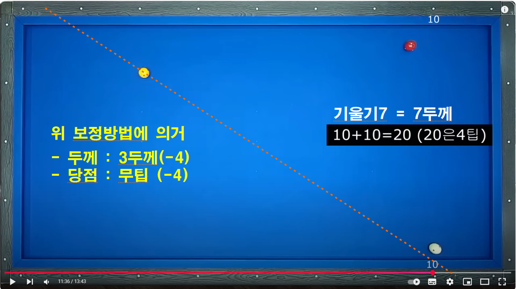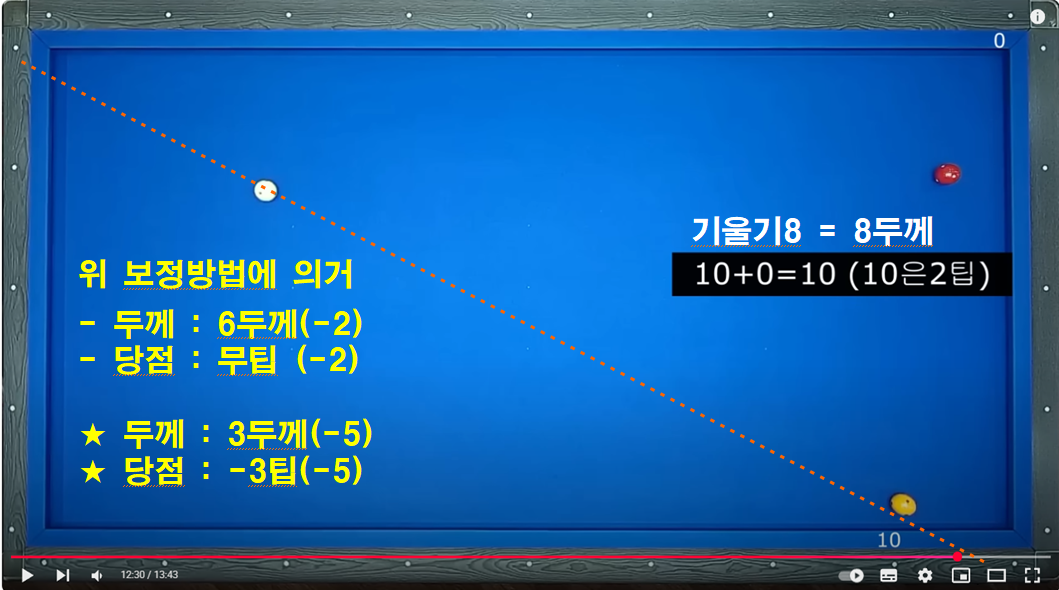 두께 3이상 및 3회전 이상일 경우 보정하는 보정방법입니다. 이 방법을 이해하면 2레일 속도로 부드럽게 치는 방법을 이해 할 수 있습니다.